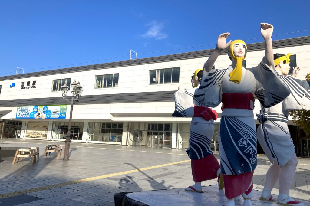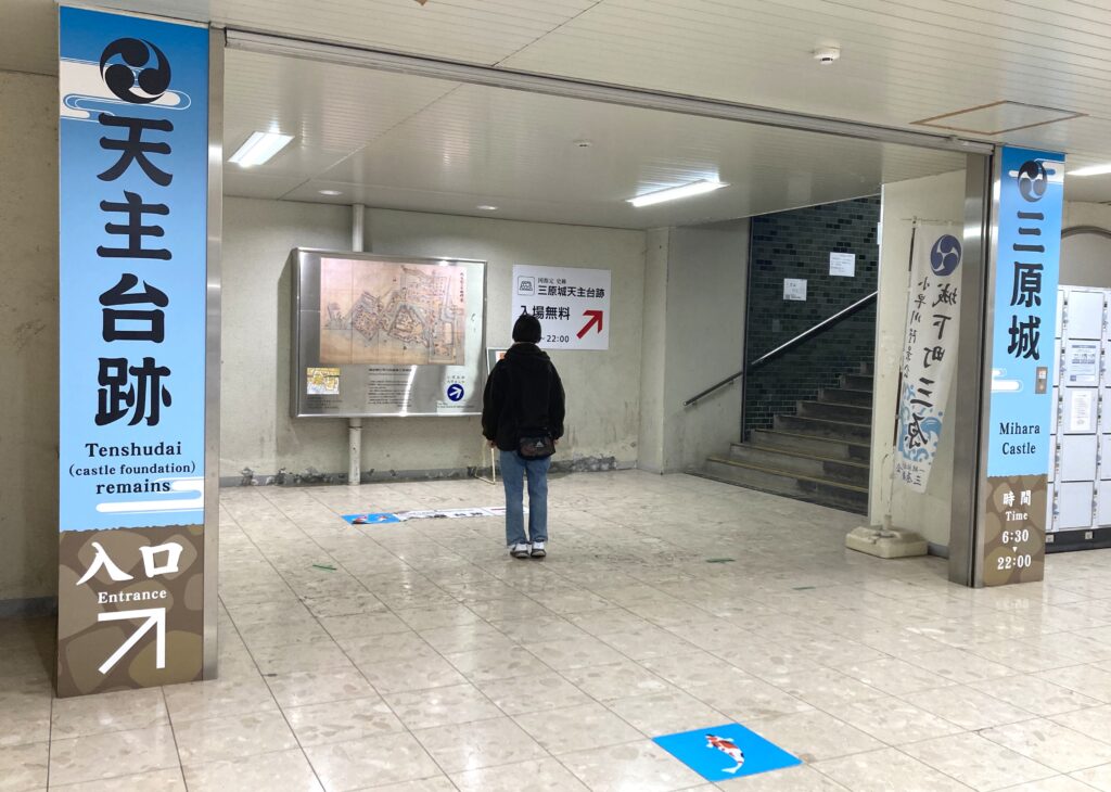 臨時バスで三原駅に帰り、駅構内から小早川隆景築城の三原城天守跡に上る。