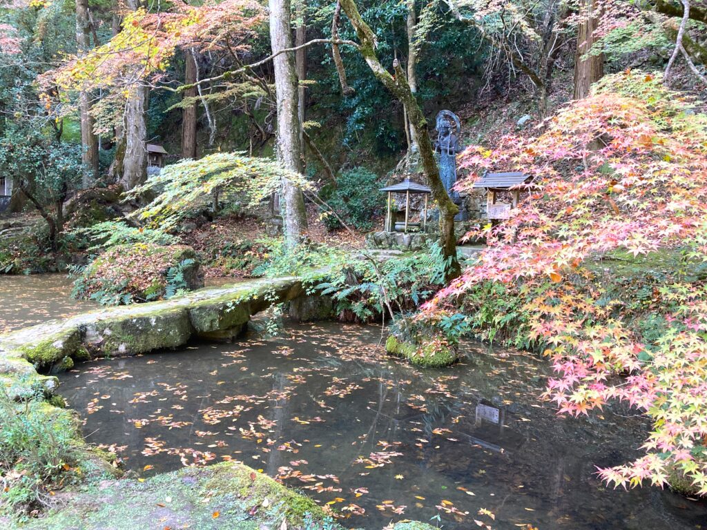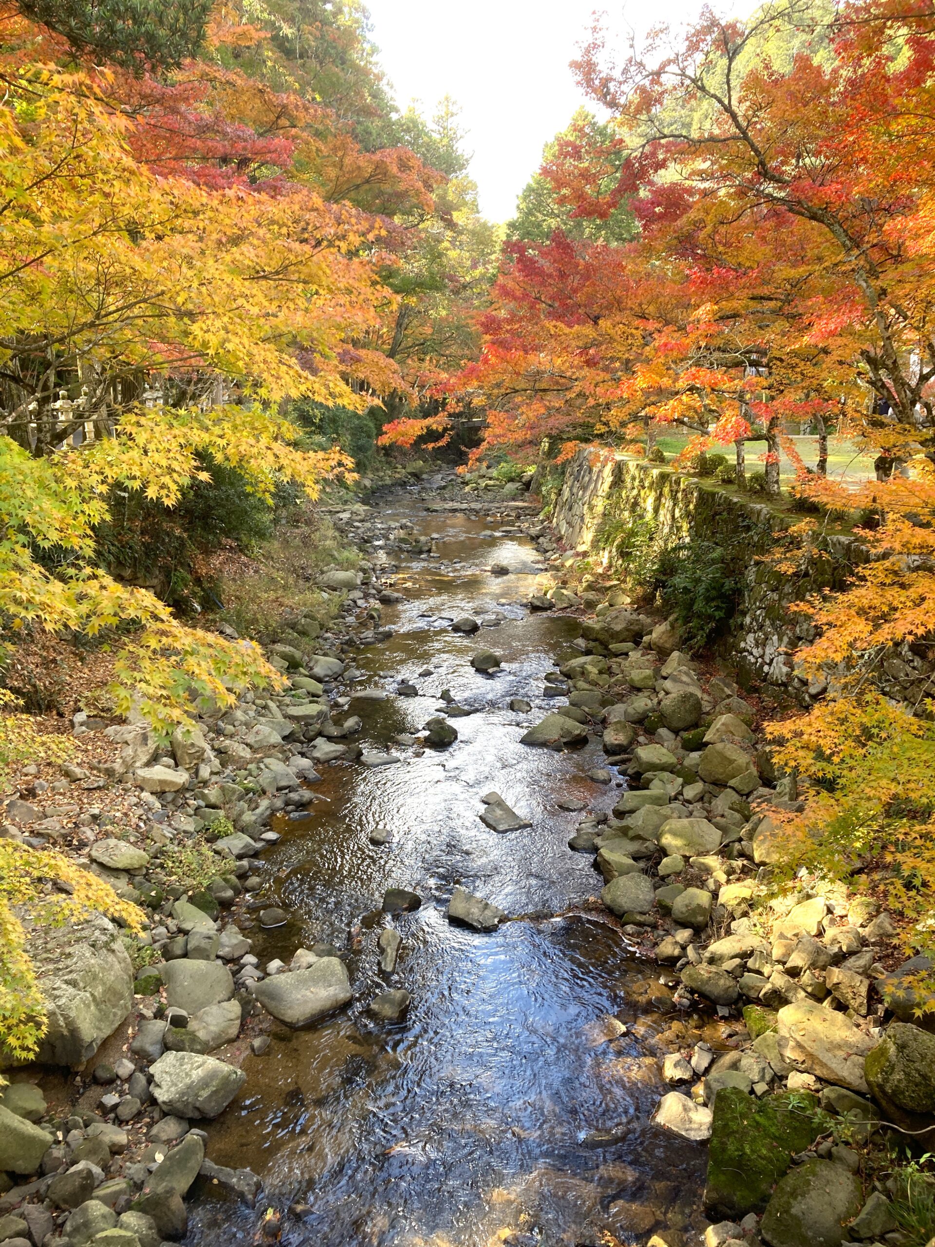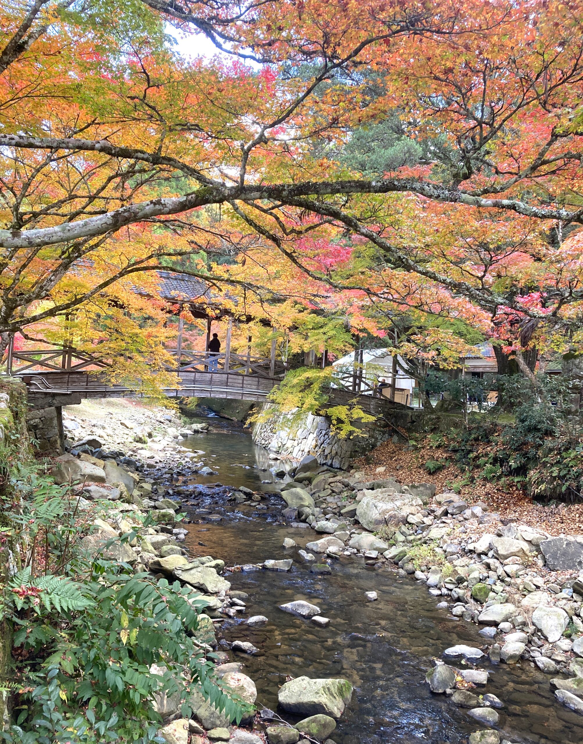 仏通寺川を覆う紅葉したもみじが眩しく鮮やかだ。