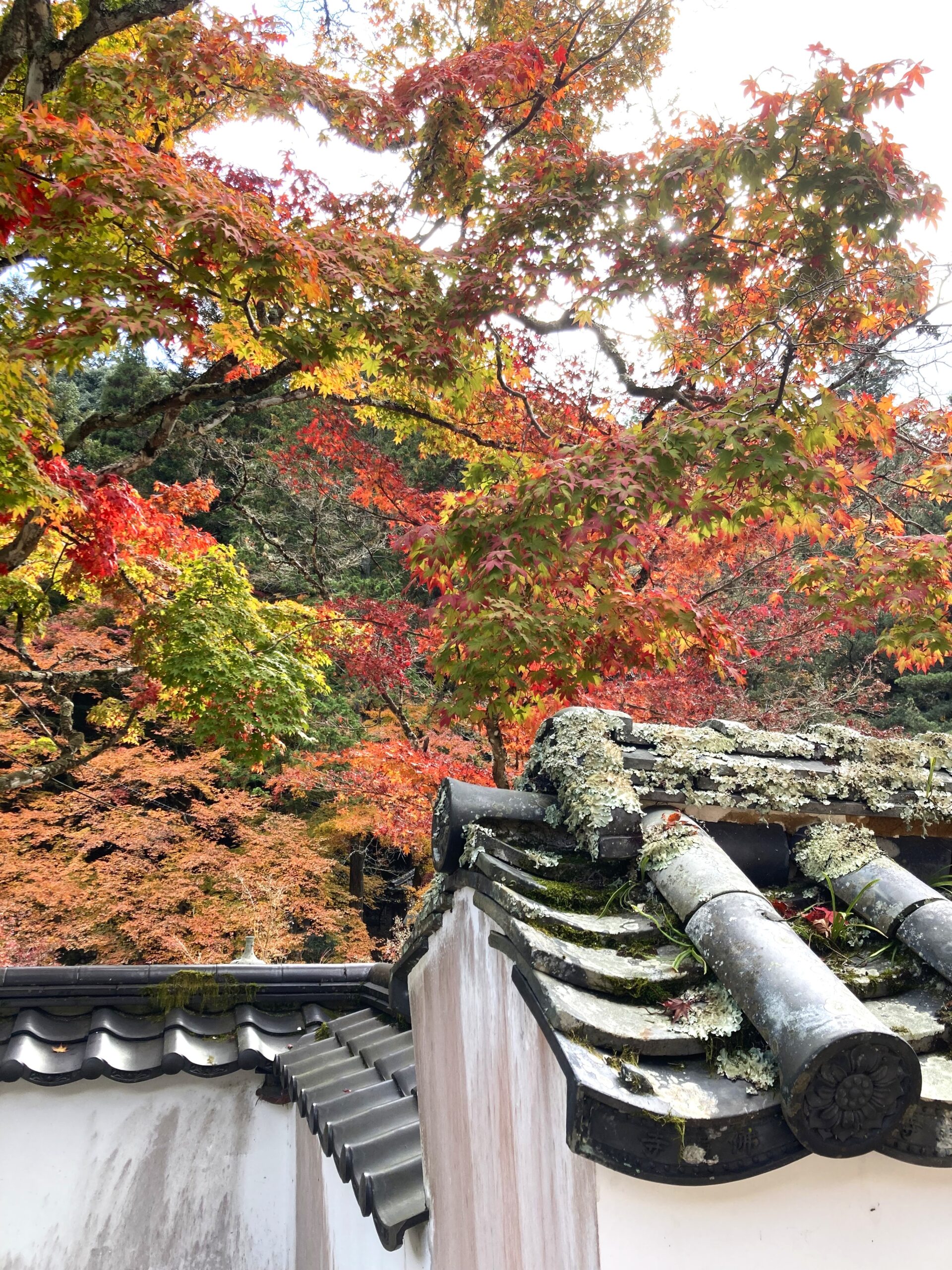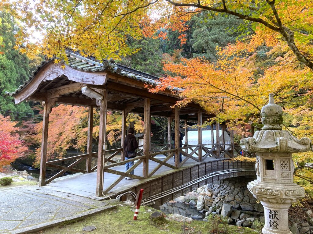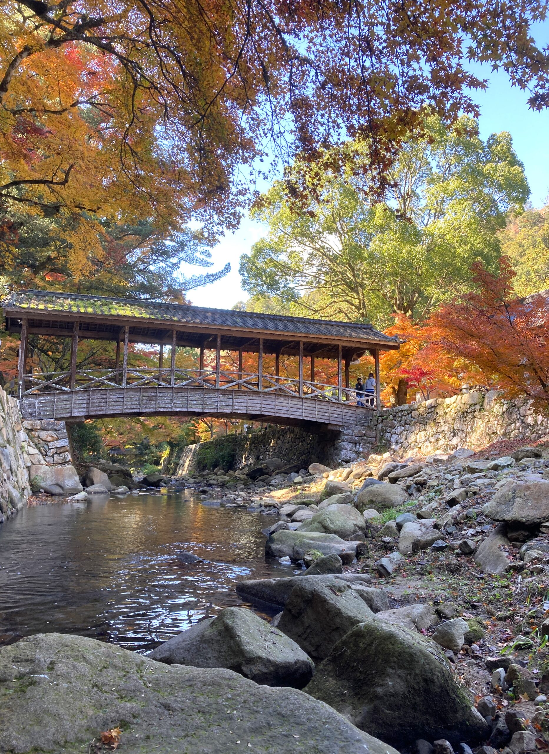 仏通寺川を覆う紅葉したもみじが眩しく鮮やかだ。
