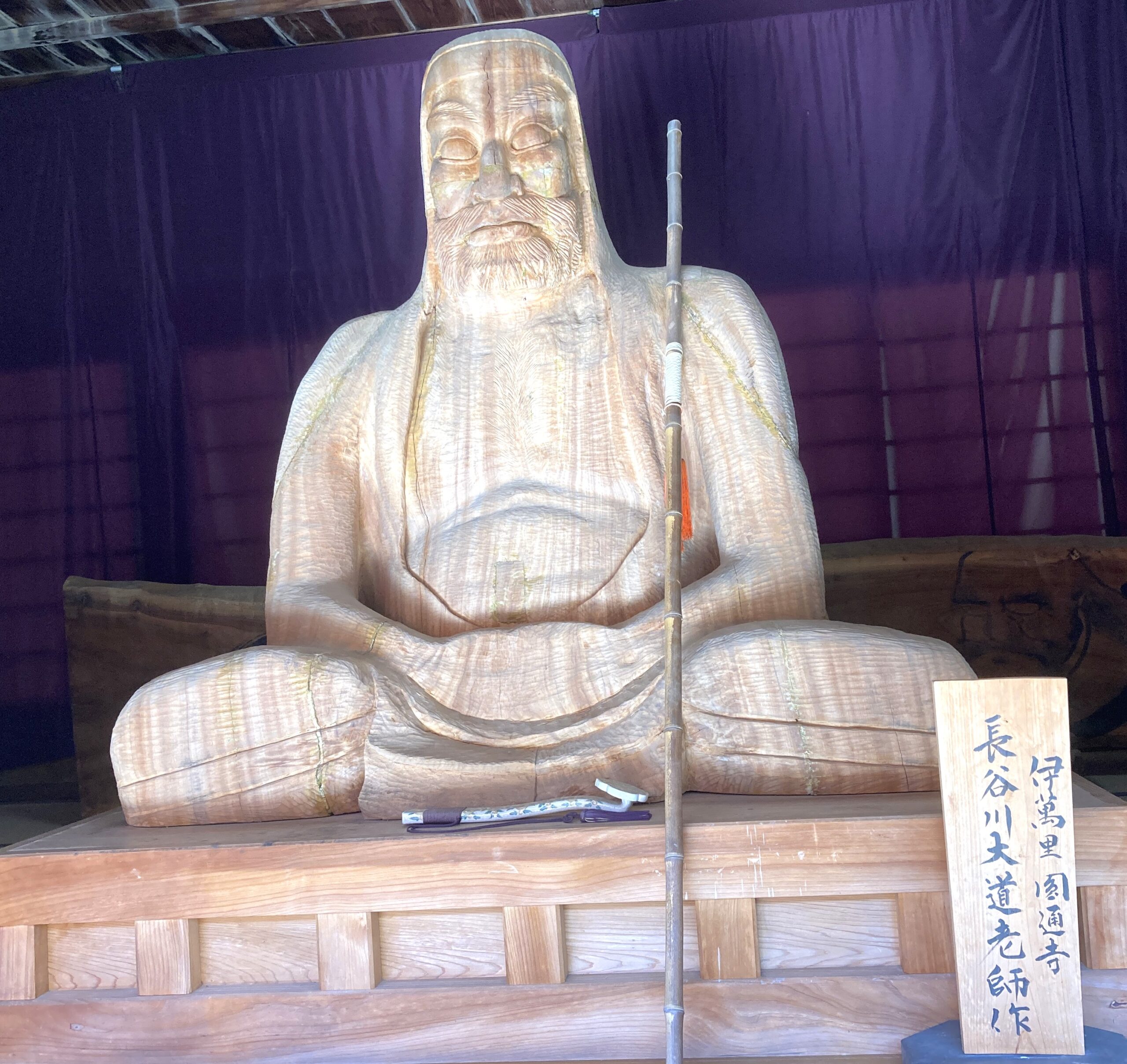 大玄関から板の間に上がると、一木彫りの座禅達磨像が出迎える。