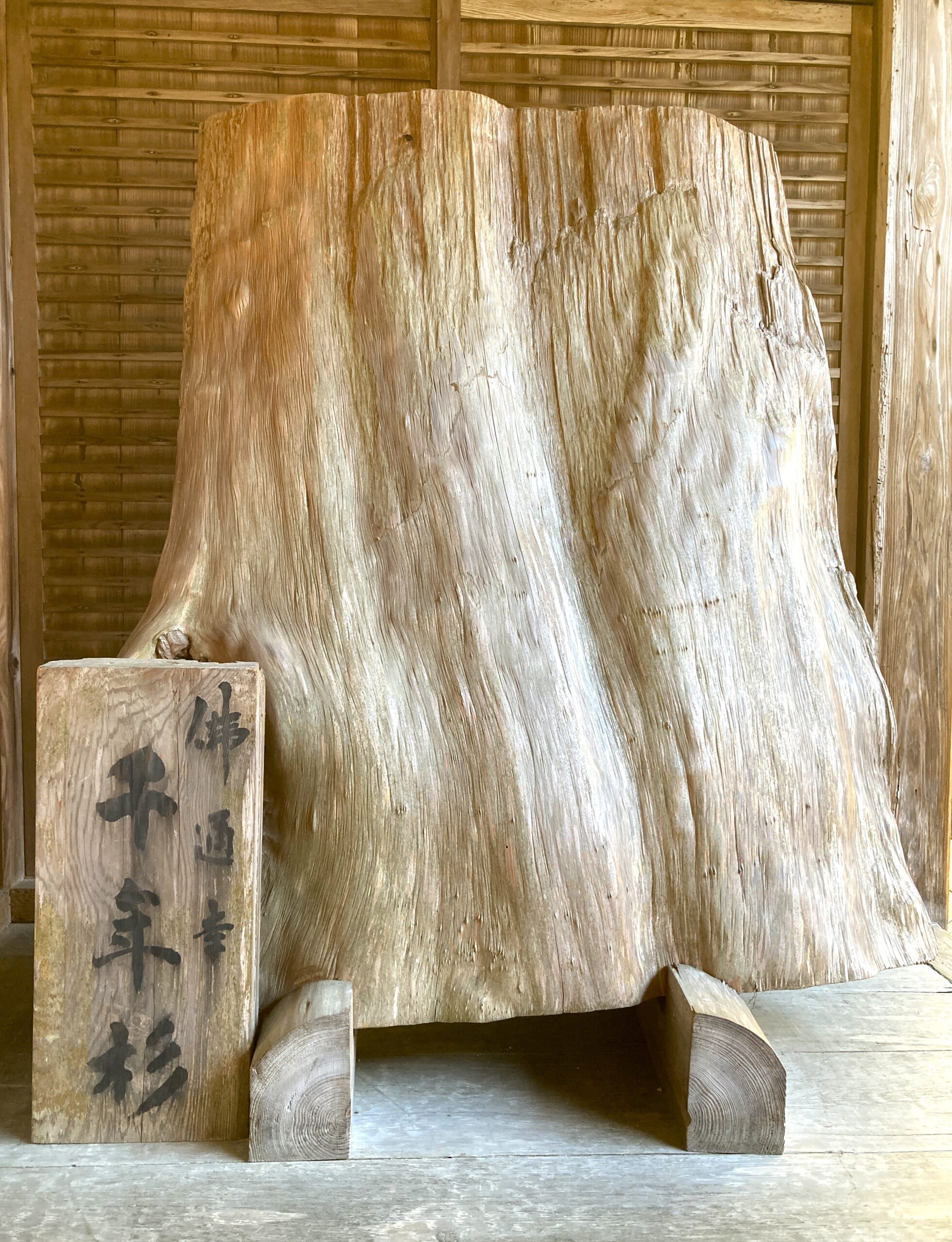 廊下奥の、台風で被害を受けた千年杉の古木を拝観。