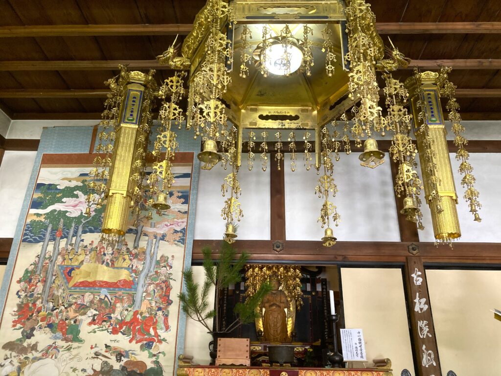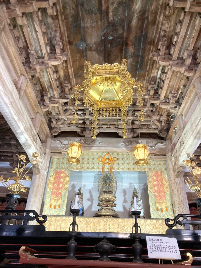 正面の釈迦三尊像が祀られている佛殿に外から参拝。