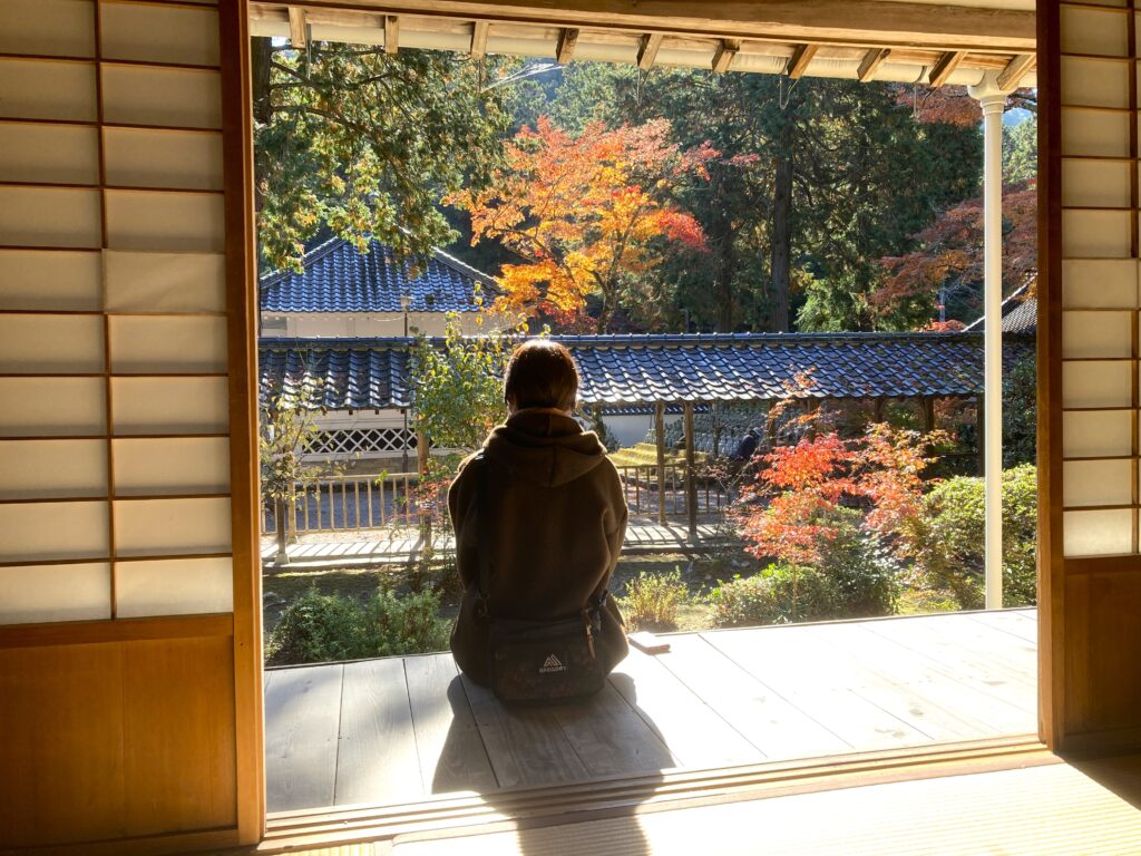 親禅堂の裏手で、紅葉を眺めて、こだまで購入したたこ飯のランチタイム。