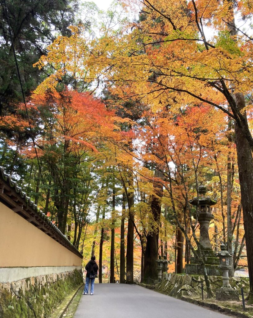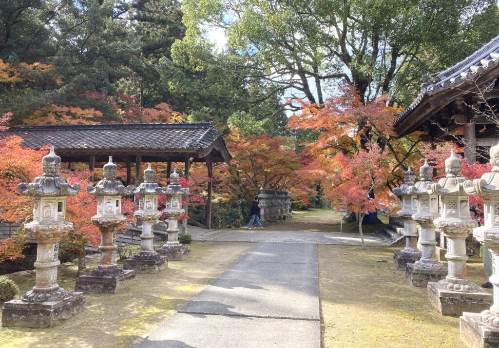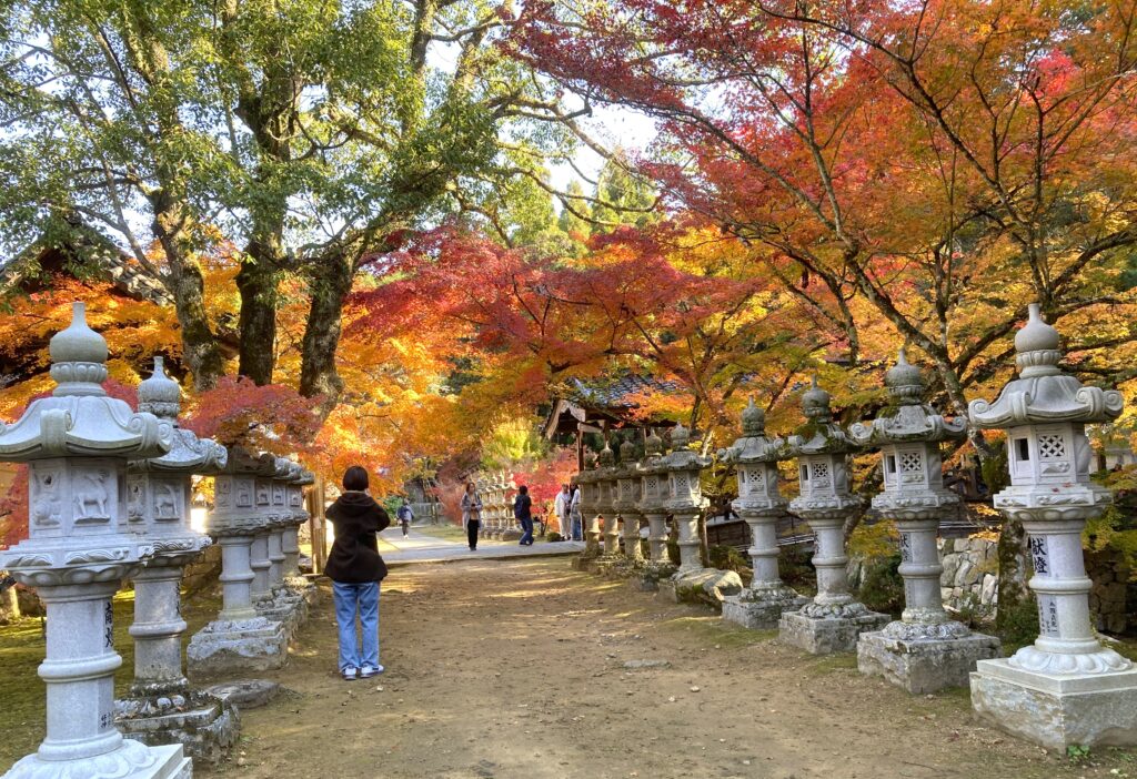 もみじが垂れ下がり、石灯籠が並ぶ参道を進む。