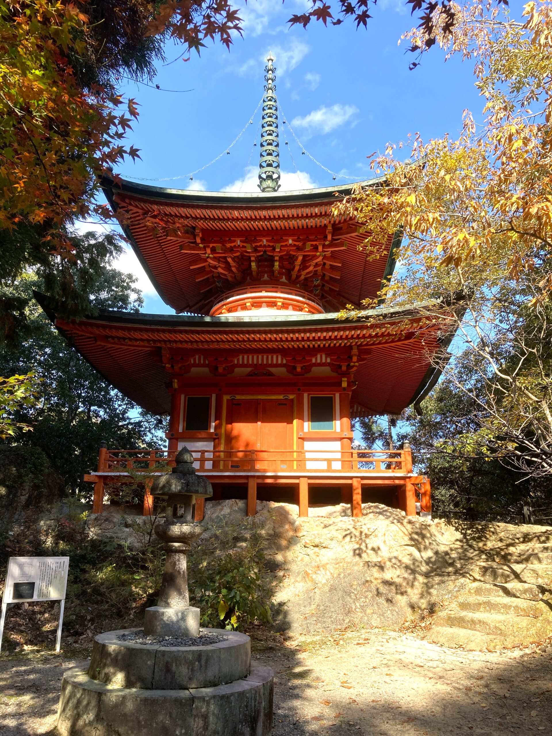 隣に地蔵菩薩が祀られた地蔵堂。高台に朱塗りの多宝塔が聳える。