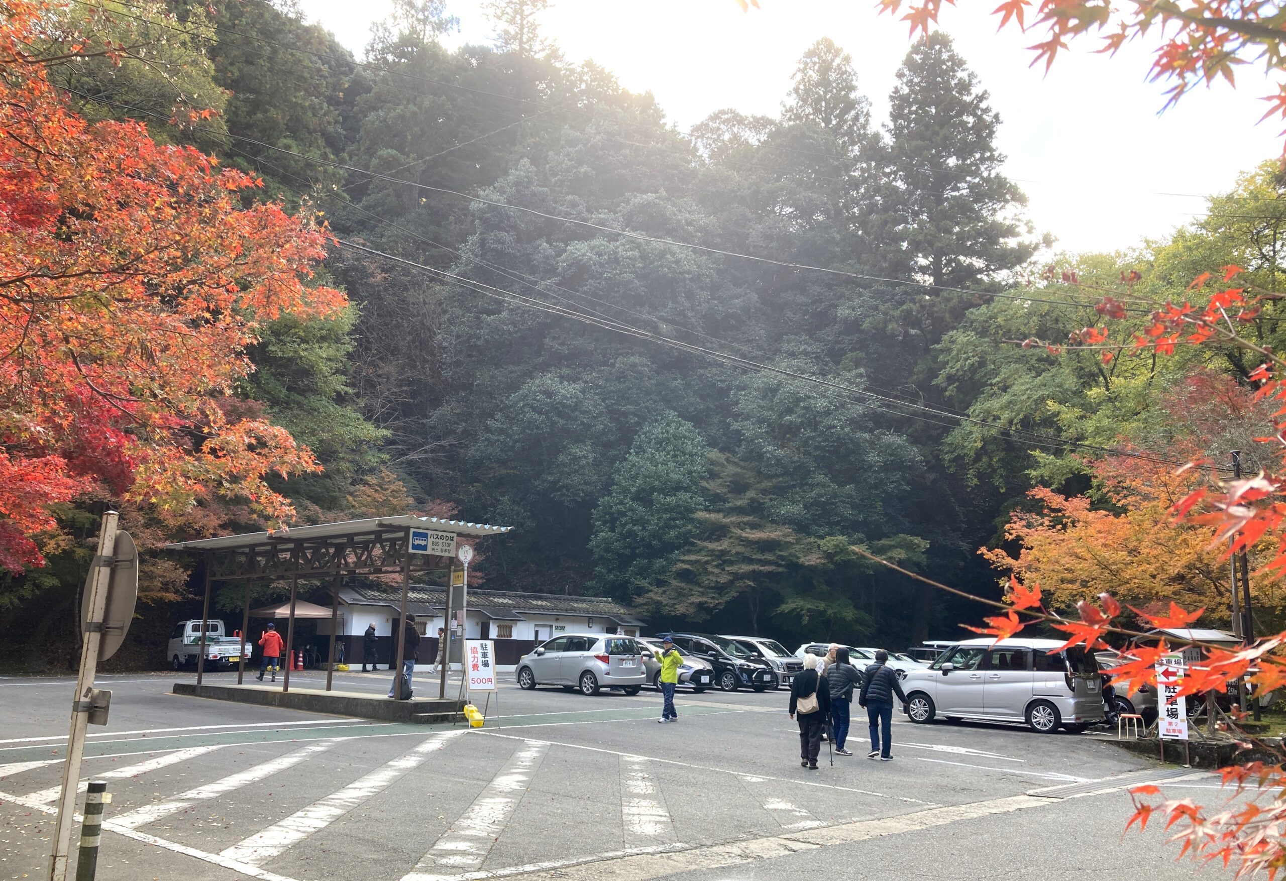 山あいの仏通寺川の狭い沿道は、紅葉時期は一方通行規制となる。