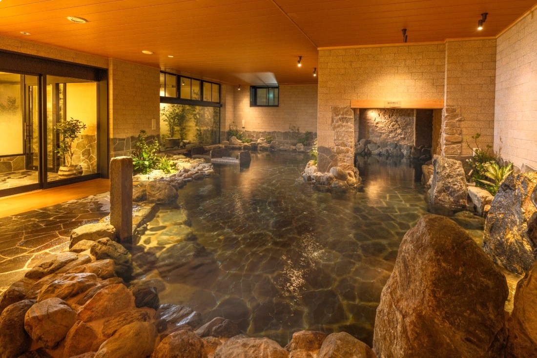 セントラルスクエアに、大浴場、展望露天風呂、家族風呂、レストラン、フリーラウンジがある。